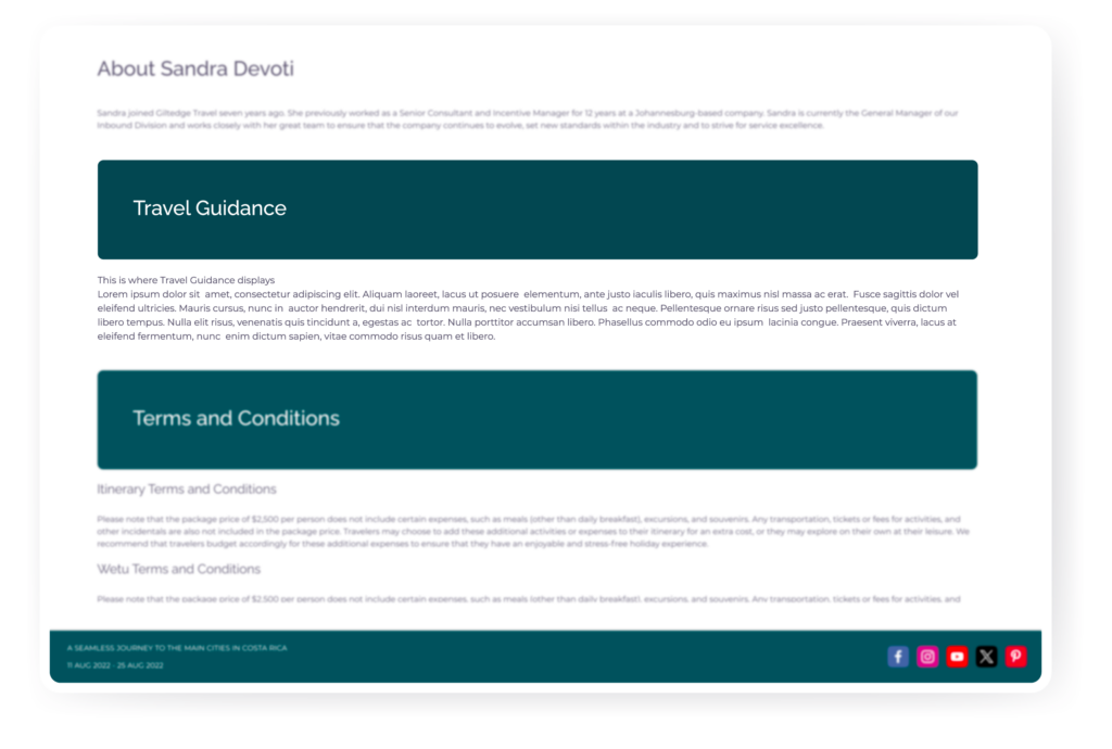 Social media accounts that you’ve added in Identities or Company details via Admin will now be reflected on the footer of Discovery itineraries. This means anyone viewing your itineraries can discover the relevant social media accounts directly from the itinerary.
